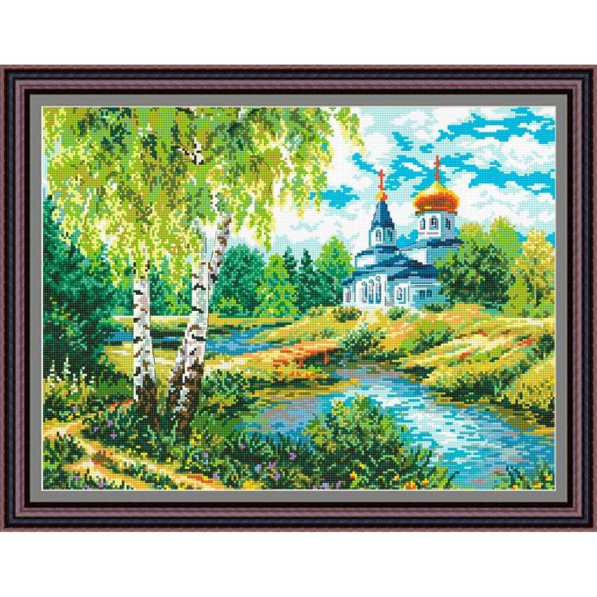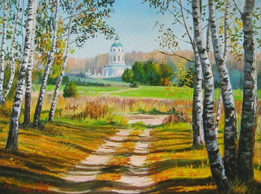 Картина березовая роща и храм