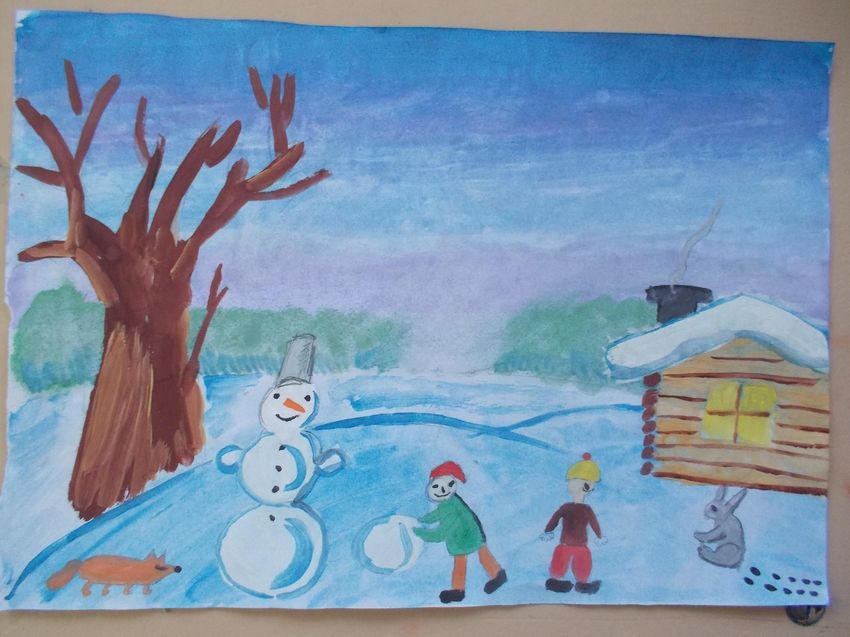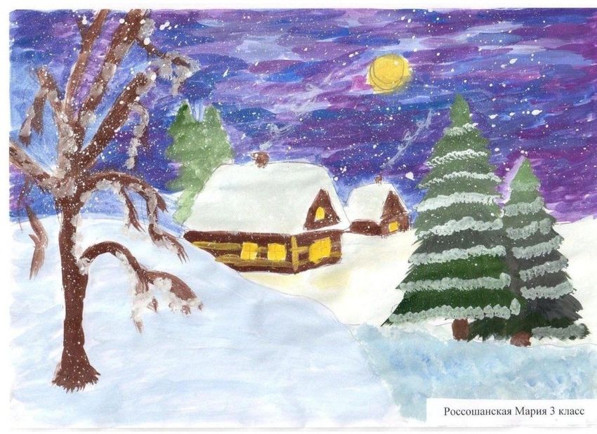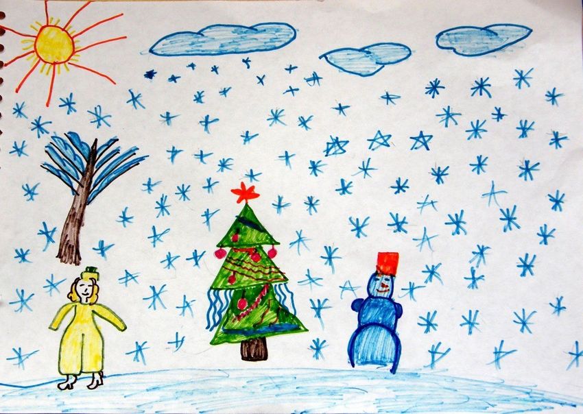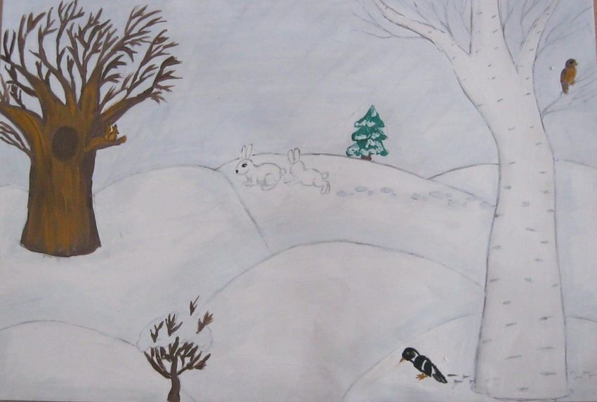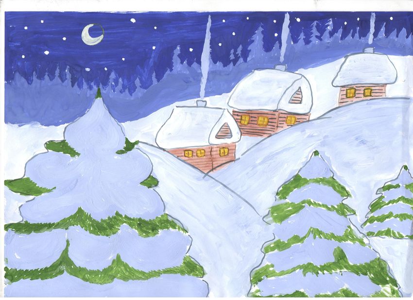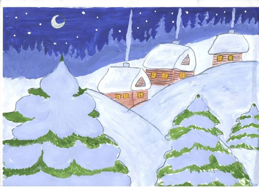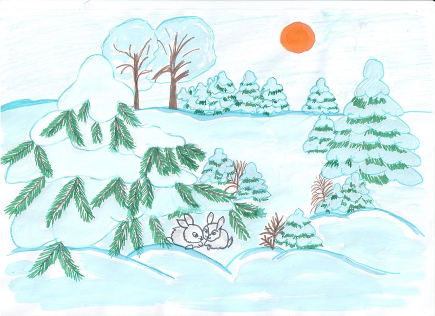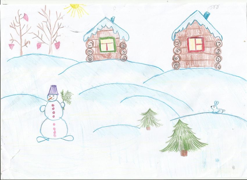 Рисунок Красота зимы отражает первоклассный взгляд на сезон. Простые линии, изображающие деревья и сугробы, формируют милый пейзаж. Детали, такие как снежинки и узоры, придают рисунку яркость. Это визуальное воплощение красоты зимнего времени, представленное с перспективы маленьких художников первого класса.