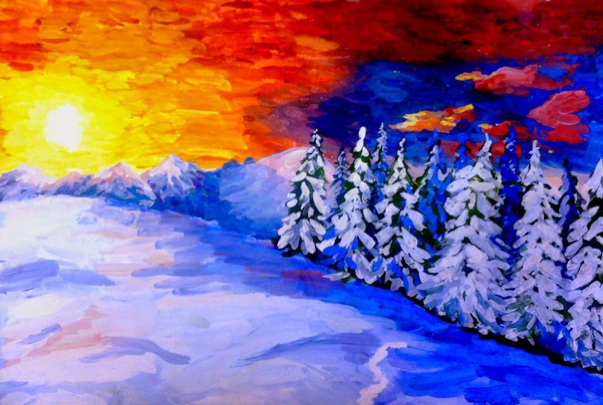 Бумага запечатлела зимний момент, оживленный красками. Яркие и холодные оттенки передают настроение зимнего пейзажа. Художник уверенно воплощает атмосферу зимы, создавая динамичные образы, полные жизни и энергии. Рисунок, выполненный красками, приглашает зрителя принять участие в празднике цвета, где каждый мазок становится отдельным аккордом в мелодии зимы.