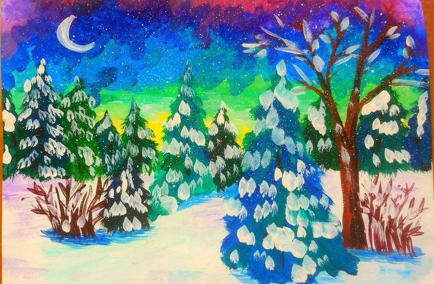 Зимняя ночь рисунок красками