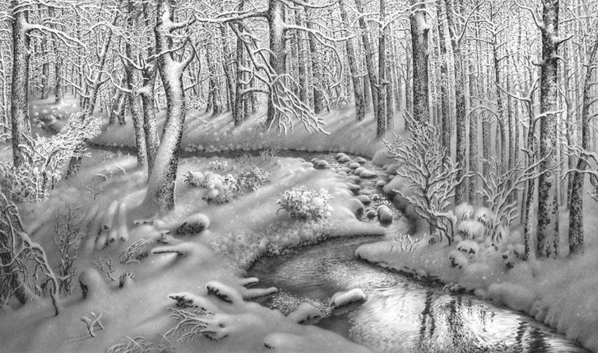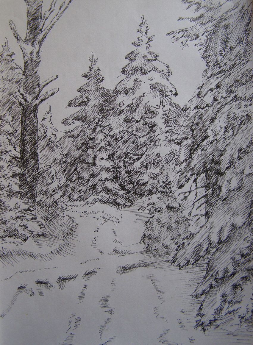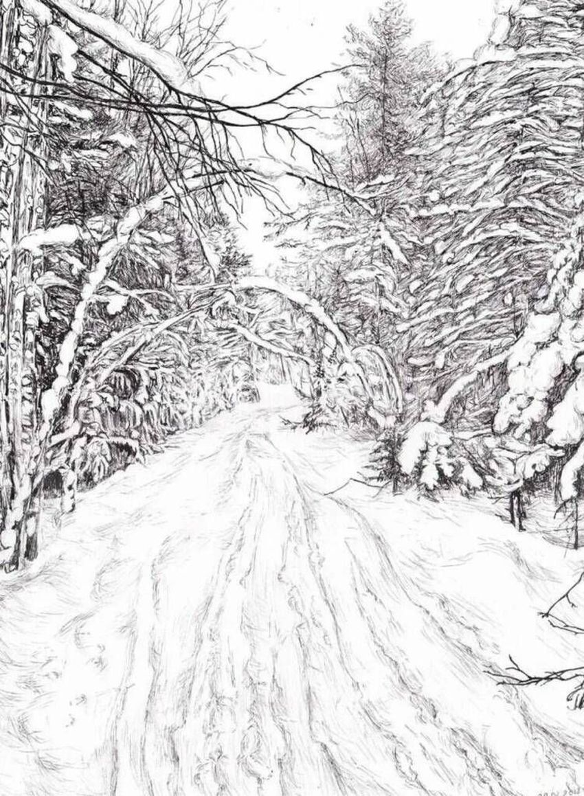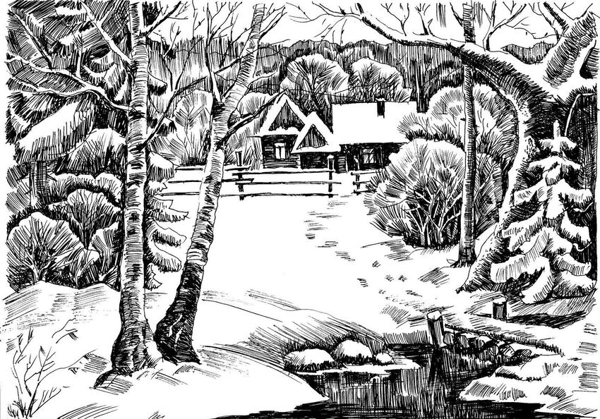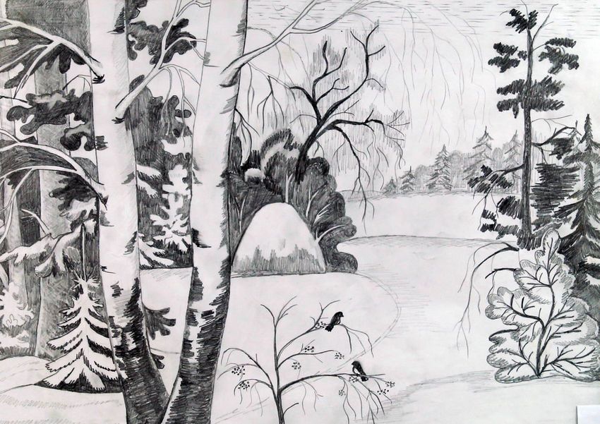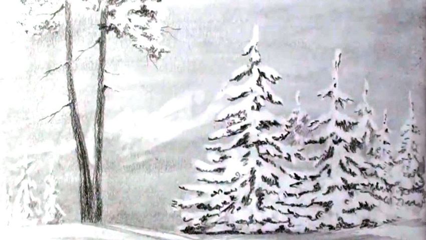 Пейзаж зимы карандашом