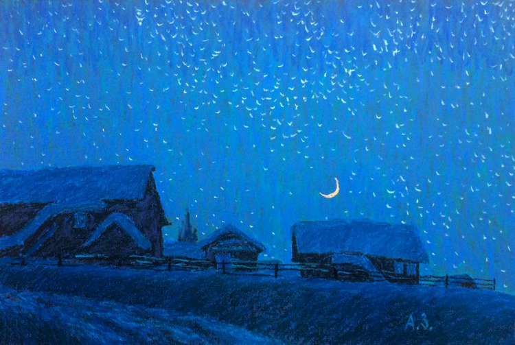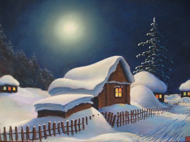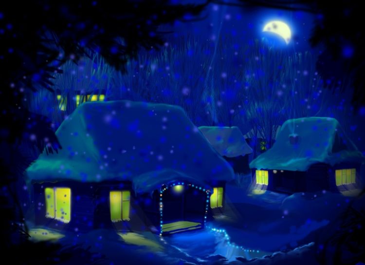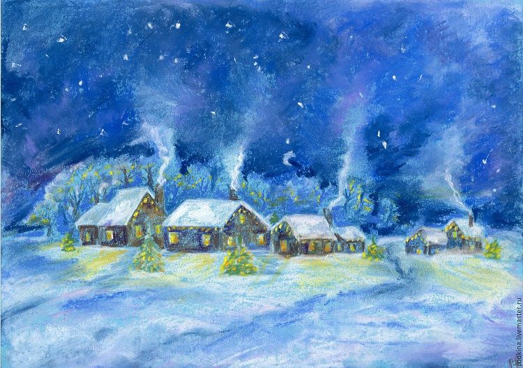 Рисунок зимняя ночь в деревне
