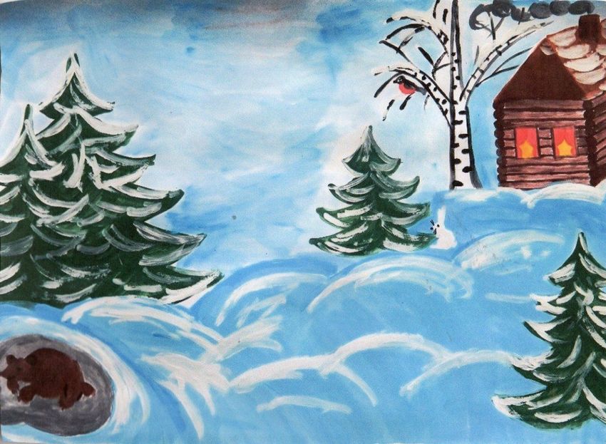Зимний пейзаж детский рисунок